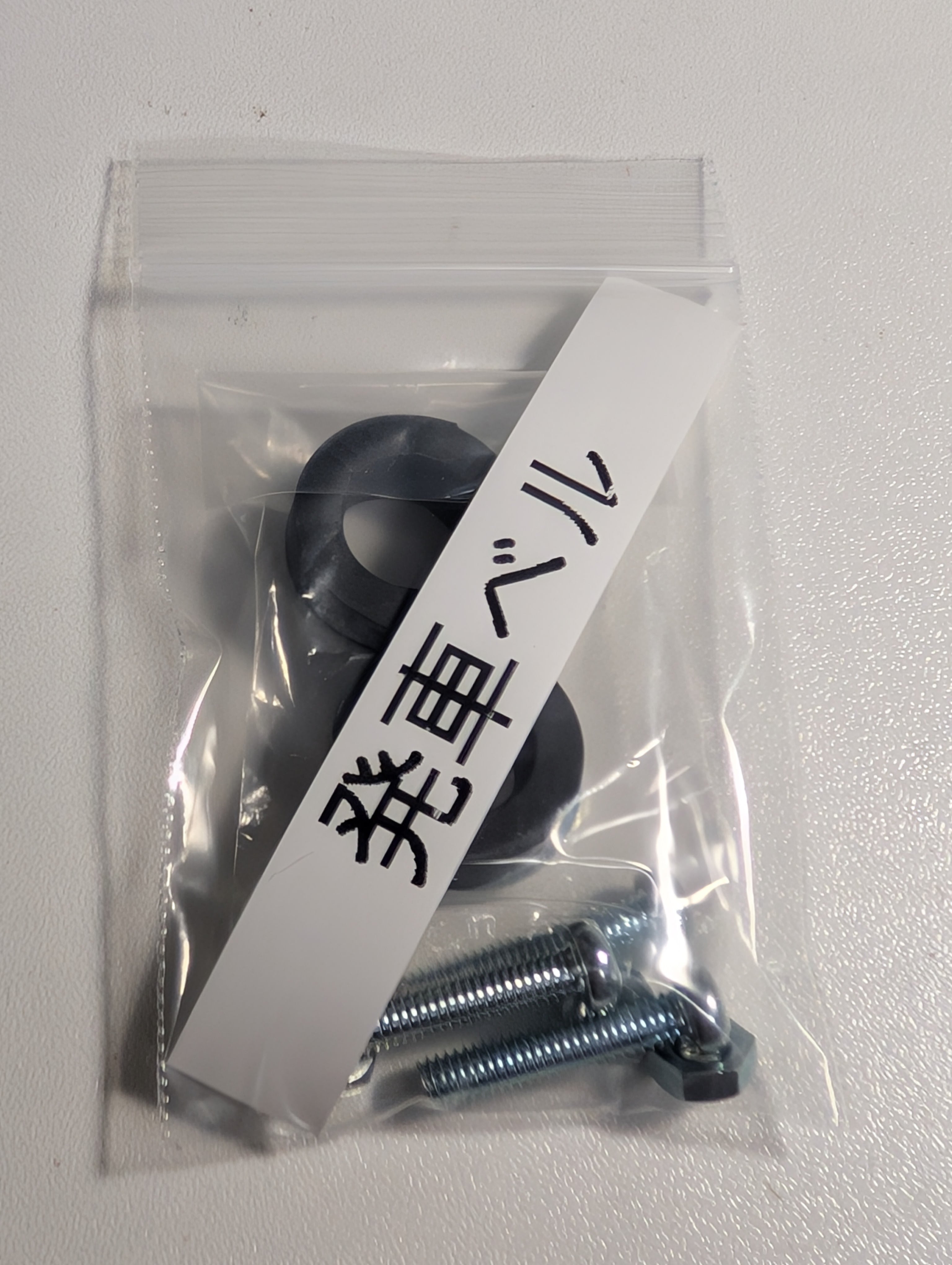 発車ベルのラベルテープと、取り付け用ネジもお付けします。